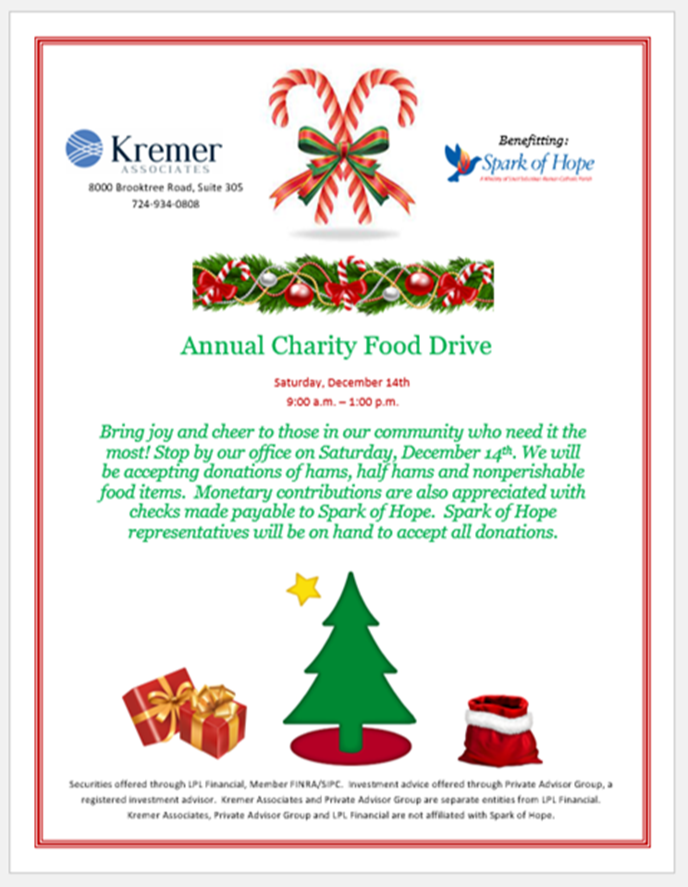 Help us make a difference for the less fortunate families in our community. Stop by our office on Saturday, December 14th. We will be accepting donations of hams, half hams and nonperishable food items. Monetary donations are also appreciated with checks made payable to Spark of Hope. Spark of Hope representatives will be on hand to accept all donations