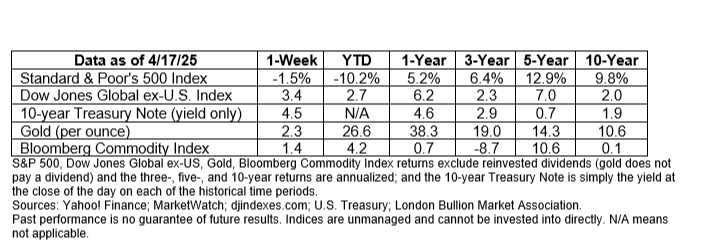 “…the chaotic rollout of…tariff policy has resulted in declines in the dollar and prices of longer-term U.S. government securities in tandem with declines in risky assets such as stocks—a reaction contrary to the currency’s and Treasuries’ usual performance as havens during episodes of market volatility. Markets stabilized in the latest week but remain on edge,” wrote Forsyth.