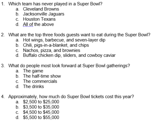 WHAT DO YOU KNOW ABOUT THE SUPER BOWL AND GAME DAY PARTIES? You might be surprised to learn that many of the friends and family who gather to watch the Super Bowl are more interested in the snacks than the game. A recent survey from Talker Research found that 48 percent of respondents care who wins the game. Fifty-four percent said the food served would decide whether a Super Bowl was great. See what you know about the Super Bowl and game day gatherings by taking this brief quiz.