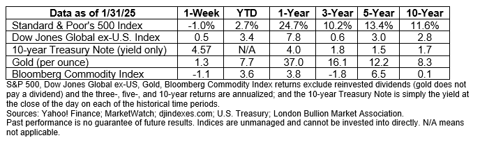 The week got off to a rough start with major United States stock indices declining sharply on concerns about competition from China in the artificial intelligence (AI) space. AI-related technology stocks sold off after a Chinese start up released a less expensive AI model, raising concerns that current tech stock valuations may be too rich, reported Rita Nazareth of Bloomberg. Over the course of the week, markets “clawed back most of those losses thanks to encouraging earnings and company strategy updates, and as some investors re-evaluated the risks U.S. firms face from Chinese competition,” reported Barron’s.