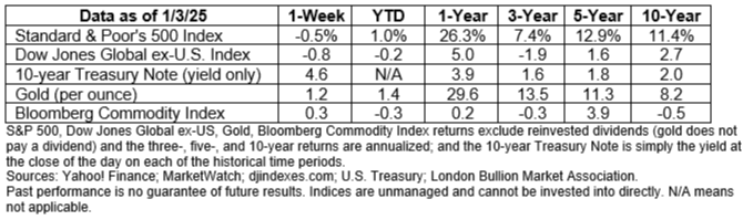 Last week, which was shorter than usual due to the New Year’s holiday, major U.S. stock indices finished lower. The yield curve continued to steepen as yields on shorter maturities of U.S. Treasuries fell, while yields on longer maturities rose.