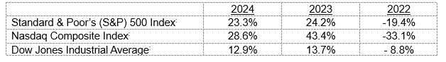 - Enthusiasm for Artificial Intelligence (AI). Magnificent Seven stocks had another big year. “The group…averaged a gain of 65 [percent] this year, compared with an average of 111 [perce t] last year, according to Dow Jones Market Data,” reported Emily Dattilo of Barron’s in December 2024. “The Mag 7 has made up 57 [percent] of the S&P 500’s…market [capitalization] gain this year versus 65 [percent] last year.”