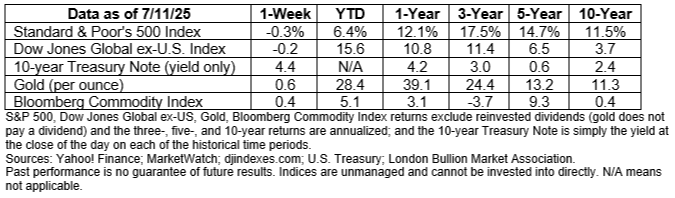 “Record highs and down weeks don’t typically go together, but the declines themselves are relatively minuscule, especially given the tariff headlines generated during the week—the possibility of 50 [percent] levies on Brazil and 35 [percent] on Canada, among others, if negotiations don’t go well—and continued attacks on Federal Reserve Chair Jerome Powell. The S&P 500, after all, is still up 26 [percent] from its April low and has gained 6.4 [percent] this year,” reported Jacob Sonenshine of Barron’s.