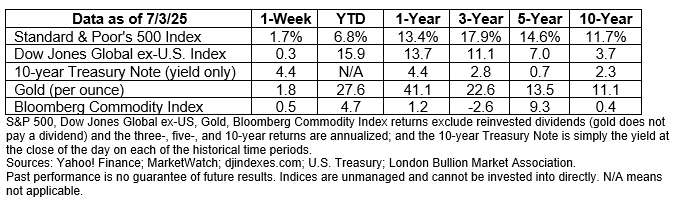 From April through June, investors rode markets up and down, banking through twists of news and events that had market moving potential. They swooped through the uncertain impact of tariffs on economic growth and inflation; the implications of a U.S. Treasury downgrade; the effects of fiscal policy changes in the Big Beautiful Bill; and conflicts in Ukraine and the Middle East. Here are some highlights from the quarter: