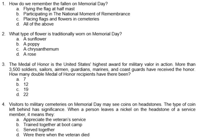 WHAT DO YOU KNOW ABOUT MEMORIAL DAY? Memorial Day offers a blend of celebration and remembrance. It’s the time when we honor the men and women who bravely sacrificed their lives in service to the United States of America. The holiday reminds us that freedom is not free and gives us an opportunity to remember those who fought and died defending our country. See what you know about Memorial Day by taking this brief quiz.